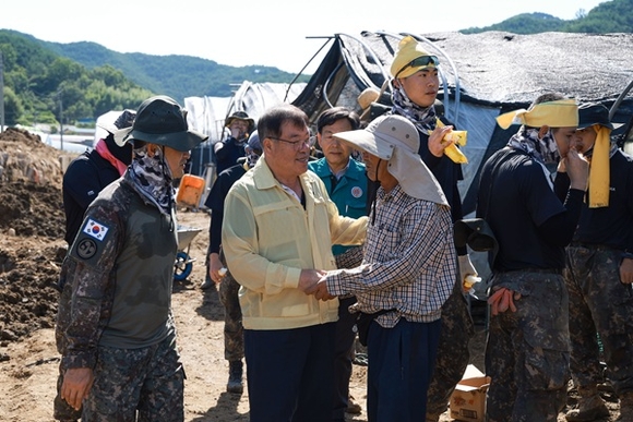이날 이승화 군수는 산청읍과 신등면 등 7곳에서 피해 복구에 힘을 보태고 있는 군 장병들을 찾아 감사를 표했다.