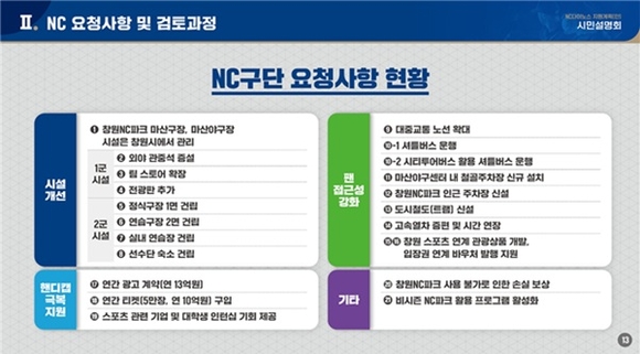 경남 창원시는 31일 오후 경남MBC홀에서 'NC다이노스 지원계획(안) 시민 설명회'를 열어 지난 5월 30일 NC 구단이 시에 전달한 21개 요청사항에 대한 지원계획안을 밝히고 시민의 의견을 수렴하는 자리를 가졌다.