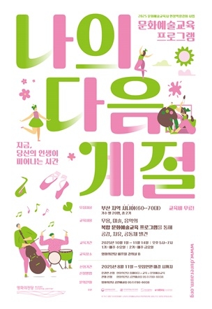 오는 10월 1일부터 11월 14일까지 부산에서 지역 시니어를 위한 복합 문화예술교육 프로그램 '나의 다음 계절'이 운영된다. 이 프로그램은 문화체육관광부와 한국문화예술교육진흥원, 부산시, 부산문화재단의 후원으로 마련됐으며, 2025 문화예술교육사 현장역량강화 사업의 일환이다.