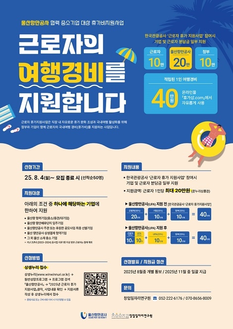 울산항만공사(UPA)는 ‘2025년 중소기업 근로자 휴가비 지원사업’을 마련하고 4일부터 수혜자 50명을 선착순으로 모집한다고 밝혔다.