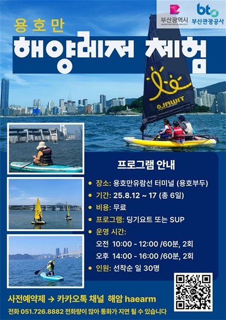 부산관광공사가 시민과 관광객을 위한 ‘용호만 해양레저 체험 프로그램’을 오는 12일부터 17일까지, 용호만유람선터미널과 용호부두 일원에서 운영한다고 밝혔다.