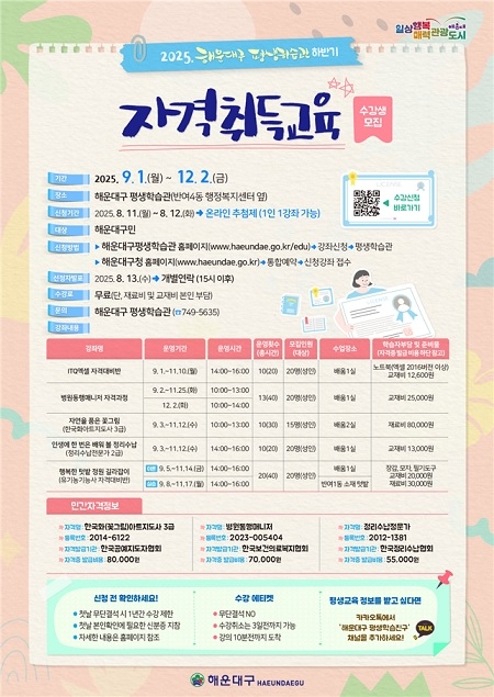 부산 해운대구가 2025년 하반기 평생학습관 자격취득교육 수강생을 모집한다고 8일 밝혔다.