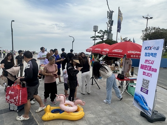 해운대해수욕장 입구 해운대스퀘어 일원에서 진행된 이벤트는 피서객들의 뜨거운 관심 속에 진행됐다. KTX-이음 정차를 염원하는 방문객들의 서명이 줄을 이었다.