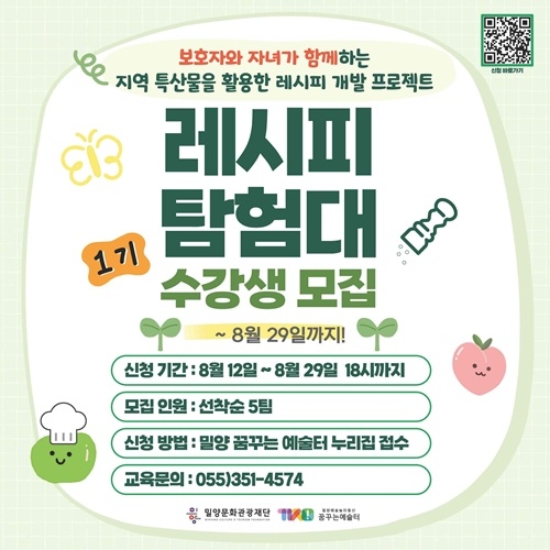 밀양문화관광재단은 12일부터 29일까지 지역 특산물을 활용한 가족 단위 융합형 문화예술교육 프로그램 '레시피 탐험대' 참가자를 모집한다고 밝혔다.