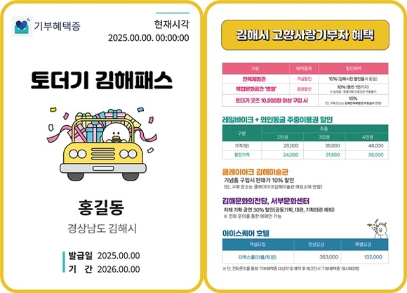 경남 김해시는 연간 10만원 이상 김해시에 고향사랑기부를 한 기부자에게 관내 관광·문화시설 이용시 다양한 할인 혜택을 제공하는 기부혜택증(토더기 김해패스) 제도를 11일부로 시행한다고 밝혔다.