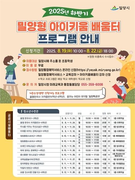 밀양시에 주소를 둔 아동이라면 누구나 무료로 참여할 수 있으며, 신청은 오는 19일부터 22일까지 밀양통합예약서비스에서 온라인으로 가능하다. 프로그램에 대한 자세한 사항은 밀양시청 대표 누리집 또는 미래교육과 통합돌봄담당을 통해 확인할 수 있다.