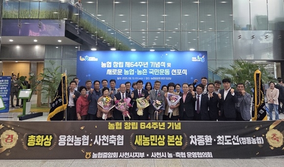 경남 사천시는 농협중앙회에서 열린 창립 제64주년 기념식에서 용현농협과 사천축협이 총화상을, 정동농협 차종환·최도선 부부가 새농민상(像) 본상을 수상했다고 13일 밝혔다.