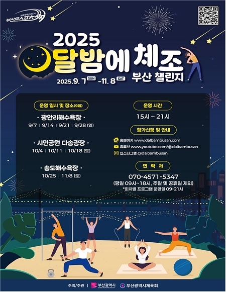 시 관계자는 “올해 처음 선보이는 ‘달밤에체조 부산 챌린지’는 시민들이 부담 없이 생활체육을 즐기며 건강을 챙길 수 있도록 다채롭게 준비했다”며 “가을밤 해변과 공원에서 가족, 친구, 이웃과 함께 건강하고 즐거운 시간을 보내길 바란다”고 말했다.
