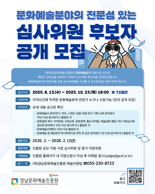 경남문화예술진흥원은 ‘문화예술분야 심사위원풀’ 구성을 위한 후보자를 공개 모집 한다고 20일 밝혔다.
