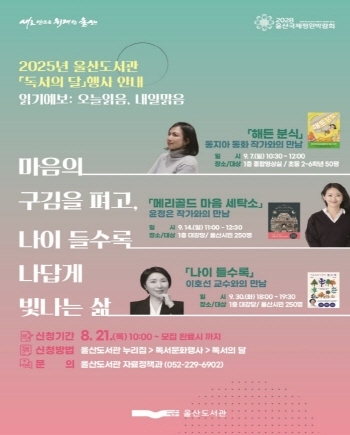 마지막으로 ‘나이 들수록’ 이호선 교수와의 만남은 오는 9월 30일 오후 6시 울산시민 250명을 대상으로 도서관 1층 대강당에서 진행된다. 삶의 기쁨과 자기돌봄의 기술을 주제로, 개인의 감정을 돌보고 심리적 회복력을 높이는 방법을 소개한다.