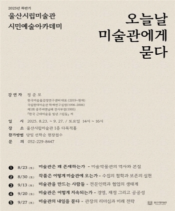 울산시립미술관은 오는 8월 23일부터 9월 27일까지 매주 토요일 오후 2시(9월 6일 제외) 미술관 1층 다목적홀에서 시민을 위한 문화예술 교육프로그램 ‘2025년 하반기 시민예술아카데미’를 개최한다고 21일 밝혔다.