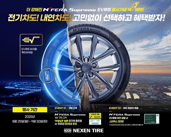 넥센타이어가 전기차와 내연기관 차량 모두에 최적의 성능을 제공하는 ‘엔페라 슈프림 EV루트’ 출시를 기념해 내달 말까지 특별 프로모션을 진행한다고 25일 밝혔다.