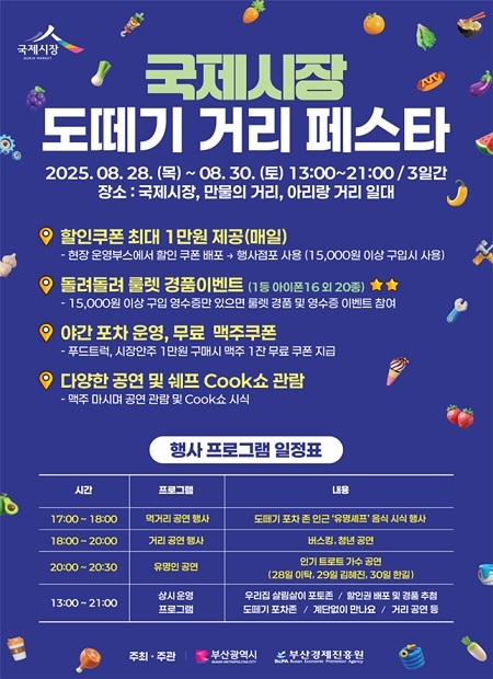 시 관계자는 “국제시장은 오랜 세월 부산의 대표 상권이자 역사와 추억이 담긴 공간”이라며 “이번 행사를 통해 시장 상인들의 매출을 늘리고, 시민과 관광객에게 다양한 볼거리와 즐길 거리를 제공하겠다”고 말했다.