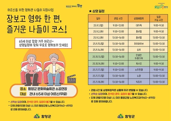 자세한 일정 및 상영작은 함양군 누리집 게시판을 통해 확인할 수 있으며, 만 65세 이상 어르신이라면 누구나 무료로 관람할 수 있다. 소공연장 좌석은 모두 125석으로, 별도의 사전 예약 없이 영화 상영 30분 전부터 신분증 제시 후 선착순으로 입장하면 된다.