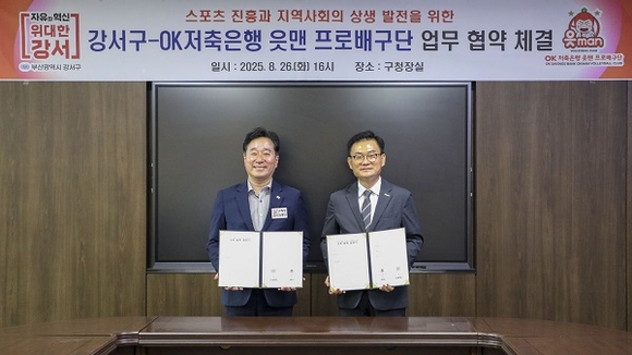 부산 강서구와 OK저축은행 읏맨 프로배구단이 지난 26일 ‘스포츠 진흥과 지역사회의 상생 발전을 위한 상호 협력 협약’을 체결했다.