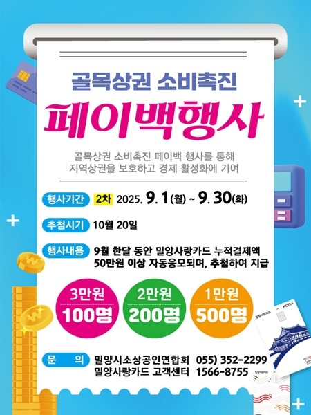참여 방법은 9월 한 달간 밀양사랑카드로 누적 50만 원 이상 결제하면 자동으로 응모되며, 추첨을 통해 총 800명에게 페이백 혜택이 제공된다. 당첨자는 △ 3만 원(100명) △ 2만 원(200명) △ 1만 원(500명)으로, 특히 1만 원 페이백 대상자는 1차 이벤트보다 100명 늘어난 500명으로 확대됐다. 페이백은 10월 20일까지 지급될 예정이다.