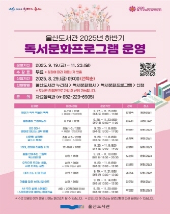 울산도서관 관계자는 “이번 하반기 프로그램은 연령대별 특성과 수요를 반영해 다양한 주제의 강좌를 마련했다”며 “앞으로도 시민의 삶에 유익한 독서문화 프로그램을 지속 발굴해 나가겠다”고 말했다.
