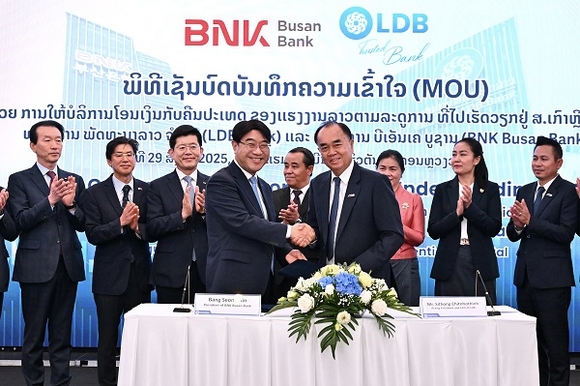 BNK부산은행이 29일 라오스 비엔티안에서 라오스 개발은행(Lao Development Bank)과 ‘라오스 계절근로자 집금 사업’에 관한 양해각서(MOU)를 체결했다고 밝혔다.