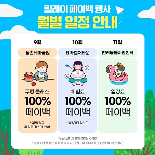 9월에는 농촌테마공원 주말 쿠킹클래스 체험비가 전액 환급되며, 10월에는 국제행사인 '요가컨퍼런스'와 연계해 요가컬처타운 내 풋스파 등 1만 원 이하 프로그램이 환급 대상이다. 11월 '농산물대전' 기간에는 반려동물지원센터 입장료가 환급된다. 다만, 환급은 예산 범위 내에서 진행되며, 상황에 따라 조기 종료될 수 있다.