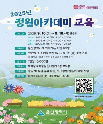 울산시는 오는 16~18일까지 3일간 운영되는‘정원아카데미’교육에 참여할 시민 90명을 모집한다고 1일 밝혔다.