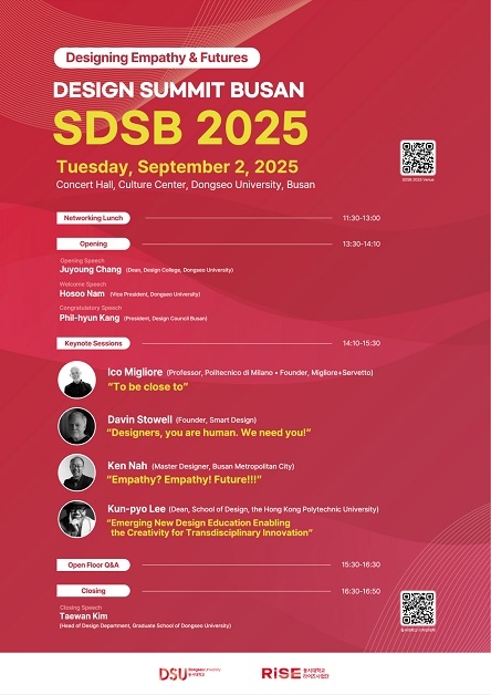 기조연사로는 ▲이탈리아 밀라노 공과대의 이코 밀리오레 교수 ▲홍콩이공대학 디자인대학장 이건표 교수 ▲데이빈 스토웰 Smart Design 설립자 ▲부산시 총괄디자이너 나건 교수가 참여한다. 이어지는 오픈플로어 Q&A 세션에서는 이들 글로벌 디자인 리더들과 지역 학생 및 학자들이 자유롭게 의견을 나누며 소통할 수 있는 장이 마련된다.