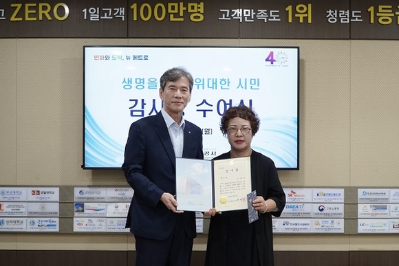 부산교통공사는 지난 1일 본사에서 부산도시철도 1호선 열차 안에서 쓰러진 승객을 심폐소생술로 구한 시민 이둘순 씨에게 감사장과 포상금을 전달했다고 밝혔다.