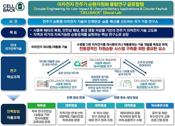 부산대는 이번 글로컬랩 사업에 교내 에너지융합기술연구소가 ‘이차전지 전주기 순환자원화 융합연구(CELLBACK, Circular Engineering for Low-impact & Lifecycle Battery Applications & Convergence Keyhub)’ 과제로 선정됐다.