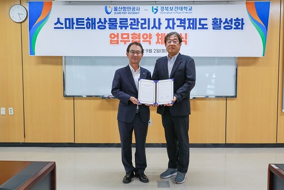 울산항만공사(UPA)는 지난 2일 공사 12층 대회의실에서 스마트 해운물류 분야의 전문인력 양성을 위해 경북보건대학교와 업무협약을 체결했다고 3일 밝혔다.