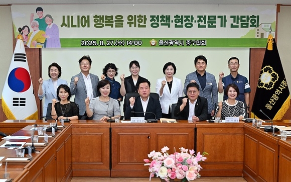 지난달 27일 울산시 중구의회에서 시니어 행복을 위한 정책·현장·전문가 간담회가 개최된 가운데 참석자들이 기념촬영을 하고 있다.(사진=영산대 제공)