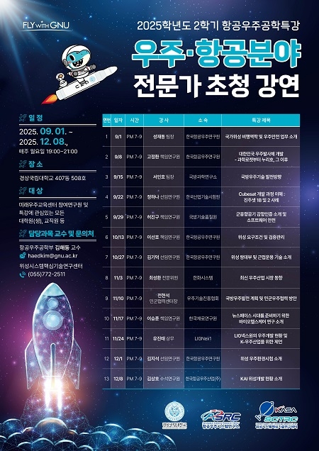 관심 있는 사람은 경상국립대 항공우주시스템연구소 누리집에서 자세한 일정과 강연 주제, 초청 강사를 확인하면 된다.