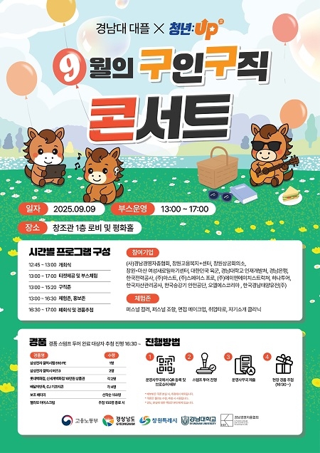 경남대학교 인재개발처 대학일자리플러스센터(거점형)는 오는 9일 오후 1시 창조관 1층 로비와 평화홀에서 ‘2025학년도 대학일자리플러스센터·청년성장 프로젝트 JOB페스티벌(구구콘)’을 개최한다고 4일 밝혔다.