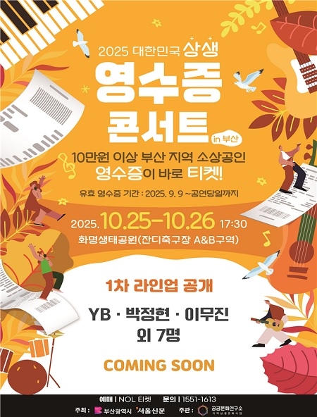 이번 콘서트는 오는 10월 25~26일 화명생태공원에서 열린다. 부산 지역 소상공인 매장에서 10만 원 이상 결제한 영수증을 공연 티켓으로 인정하는 전국 유일의 상생형 문화 축제로, 단순한 공연을 넘어 소비와 문화를 결합한 새로운 모델을 제시한다는 점에서 주목된다.