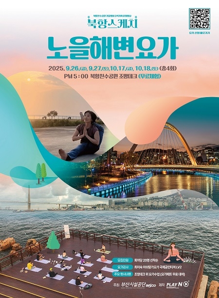 첫째, 노을해변요가 프로그램은 9월말부터 10월중순까지 북항친수공원 조망데크에서 총 4회 무료로 개최된다. 요가체험 장소인 조망데크는 공원 입구에서 제6보도교를 지나 탁트인 바다를 바로 접할 수 있는 최적의 힐링 공간이다.