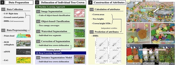 이번 연구는 기존 산림에 적용하던 ‘Watershed Segmentation(WS) 기법’의 한계를 극복하기 위해 객체 기반 분류(OBIA)와 딥러닝 모델(Mask R-CNN)을 결합한 것이 특징이다. 이를 통해 건물·차량·가로등 등 다양한 도시 인공 구조물로 인한 수관 분리 오류를 개선했으며, 딥러닝 모델의 노동집약적인 훈련 데이터 제작 과정의 효율성도 향상시켰다.