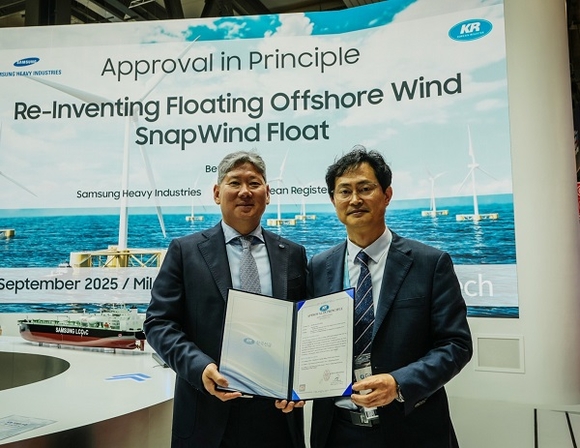 한국선급(KR)은 이탈리아 밀라노에서 열리고 있는 세계 최대 가스 에너지 전시회인 ‘가스텍(Gastech) 2025’에서 삼성중공업이 개발한 ’SnapWind Float – 15MW급 부유식 풍력발전 하부구조물’에 9일(현지시간) 개념 승인(AIP, Approval In Principle)을 수여했다고 밝혔다.