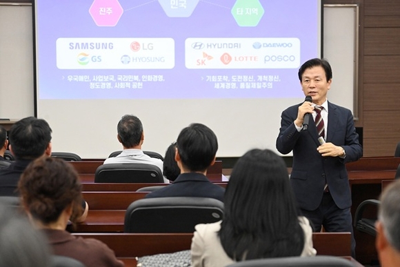 이어 “인공지능, 기후변화, 저성장의 시대를 살아가고 있는 21세기 최고경영자들에게 도전 정신과 창조 정신이라는 일반적인 기업가정신에 더해 인간 존중과 공동체 가치를 중시하는 진주 K-기업가정신에 주목해야 한다”고 말했다.