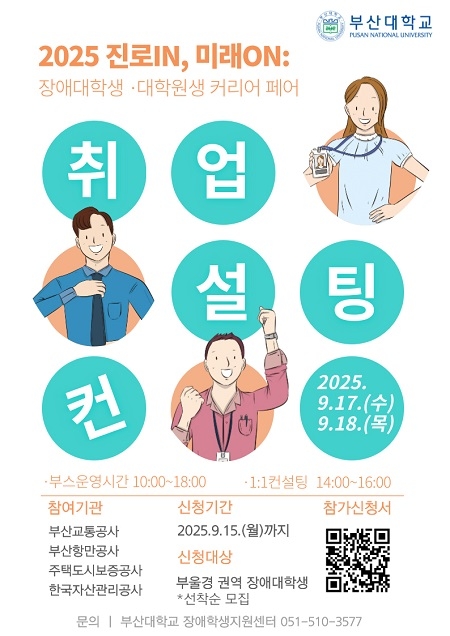 이번 장애대학생 진로·취업 컨설팅 행사는 부산대가 학부생과 대학원생의 진학·취업·창업을 통합적으로 지원하기 위해 17~18일 교내에서 개최하는 '2025 진로 IN, 미래 ON : 대학생·대학원생 커리어 페어' 행사와 함께 진행된다.