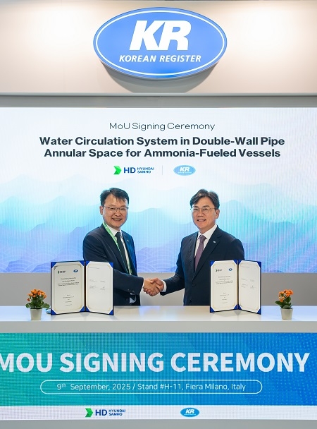 한국선급(KR)이 이탈리아 밀라노에서 열리고 있는 ‘가스텍 2025(Gastech 2025)’ 전시회에서 HD 현대삼호와 ‘암모니아 연료추진선박의 이중관 환형 공간 내 청수 순환시스템’ 공동 개발을 위한 업무협약(MOU)을 9일(현지시간) 체결했다. 이번 협력은 차세대 친환경 연료로 주목받는 암모니아 추진선의 안전성 강화를 위해 추진됐다.