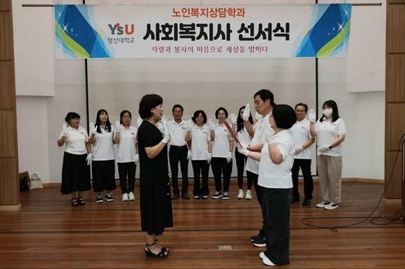 와이즈유 영산대학교 노인복지상담학과는 2023년 학과 창립 이래 처음으로 ‘사회복지사 선서식’을 개최했다고 12일 밝혔다. 이번 행사는 사회복지사로 성장할 3학년 학생 72명을 대상으로 전문직으로서의 윤리와 소명을 다짐하는 뜻깊은 자리였다.