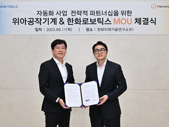 공작기계 전문기업 위아공작기계와 협동로봇 전문기업 한화로보틱스가 전략적 업무협약(MOU)을 체결하며, 협동로봇 기반 스마트 자동화 시장 공략에 본격 나선다.
