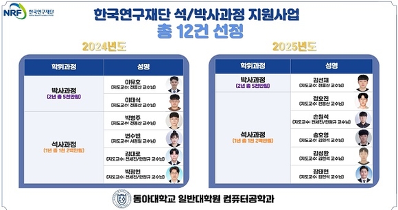 동아대 일반대학원 컴퓨터공학과는 올해 한국연구재단 석·박사과정 지원사업에서 6명이 신규로 선정됐을 뿐만 아니라, 지난해에도 6명이 선정되는 등 최근 2년간 총 12명이 이 사업에 선정되는 성과를 거뒀다.