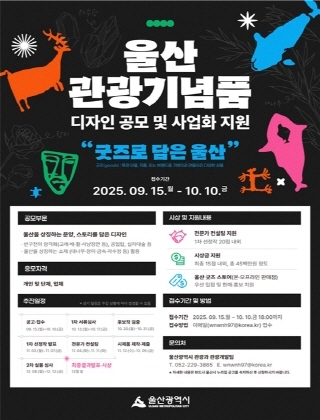 시 관계자는 “최근 케이팝 데몬 헌터스 열풍으로 K-관광기념품(굿즈)에 대한 관심이 높아진 만큼, 반구천의 암각화·공업탑·십리대숲·고래 설화 등 다양한 소재를 활용해 울산을 상징할 수 있는 차별화된 작품이 나오길 기대한다”며 “울산만의 독특한 정체성을 담아낼 관광기념품 개발에 많은 관심과 참여를 바란다”고 말했다.