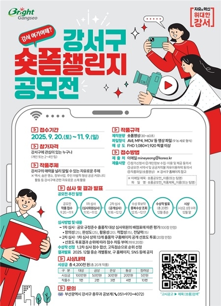 이번 공모전은 강서구에 관심 있는 누구나(개인 또는 2~4인 팀) 참여할 수 있으며, 강서구의 다양한 매력을 알릴 수 있는 자유로운 주제를 담아 30~60초 분량의 숏폼 영상을 제작해 제출하면 된다. 작품 소재는 ▲역사 ▲숨은 명소 ▲정부 사업 ▲주민 자발적 공공 커뮤니티 활동 등 강서구와 관련된 것은 무엇이든 가능하다.
