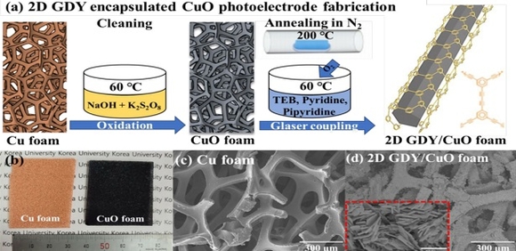 연구팀은 구리 폼(Cu foam)을 산화시켜 산화구리 폼(CuO foam)을 제작한 뒤, 2차원 GDY를 합성해 2D GDY/CuO foam 이종접합 광전극을 구현했다. 이를 활용해 태양광 기반 수소 생산 실험을 진행했으며, 동시에 밀도범함수 이론(Density Functional Theory, DFT)을 적용해 실험과 이론을 정합함으로써 연구 결과의 타당성을 입증했다.