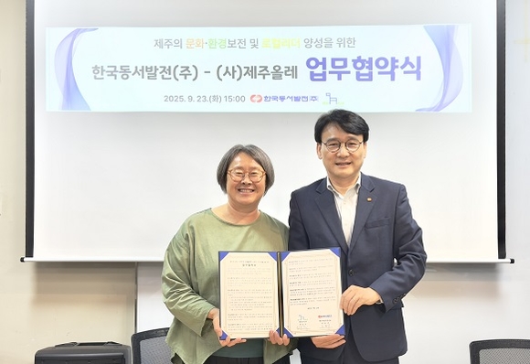 한국동서발전 제주사업추진단과 (사)제주올레는 지난 23일 서귀포 제주올레여행자센터에서 ‘제주의 문화·자연환경 보전 및 지역인재 양성을 위한 업무협약’을 체결했다고 24일 밝혔다.