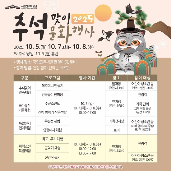 국립진주박물관은 민족 최대의 명절 추석을 맞이해 내달 5일, 7일, 8일 3일간 박물관 일원에서 2025년 추석맞이 문화행사를 개최한다고 25일 밝혔다.