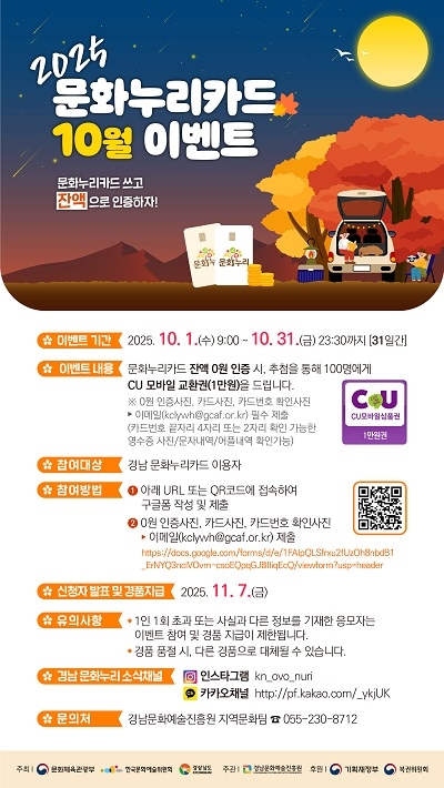 경남도와 경남문화예술진흥원은 도내 문화누리카드 이용자 대상으로 ‘2025 문화누리카드 10월 이벤트’를 내달 1일부터 31일까지 문화누리카드 잔액 0원 인증 시, 추첨을 통해 CU 모바일 1만 원 교환권을 증정한다고 30일 밝혔다.