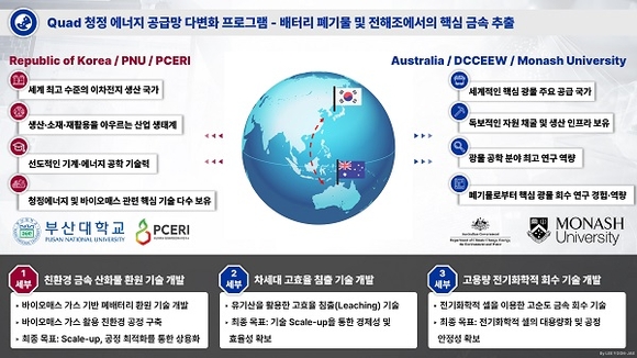 이번 사업은 올해 10월부터 2028년 3월까지 2년 이상 진행되는 연구로, 주관기관인 호주 모나쉬대와 부산대를 포함해 호주·한국·인도·태국 등 총 4개 국가가 참여한다. 이를 통해 바이오매스 가스를 이용한 폐배터리 및 광미 환원 기술, 차세대 침출 기술, 전기화학적 회수 기술 개발 등을 목표로 국제공동연구를 진행할 계획이다.
