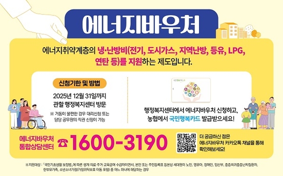 한편 2025년도 에너지바우처는 올해 12월 31일까지 가까운 읍·면·동 행정복지센터를 통해 신청이 가능하다. 또한 ‘국민행복카드’ 는 전국 농협은행 및 농·축협 영업점에서 발급받을 수 있다.