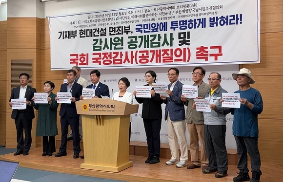 이들은 13일 부산시의회 브리핑룸에서 기자회견을 열고 “가덕도신공항은 대한민국의 미래 물류·산업·균형발전의 핵심이자 부울경 시민의 오랜 염원이 담긴 국가 전략사업”이라며 “현대건설은 주관사로서의 책임을 망각한 채 계약 이행을 거부하고 6개월 동안 단 한 차례의 시추조사도 하지 않았다”고 비판했다.